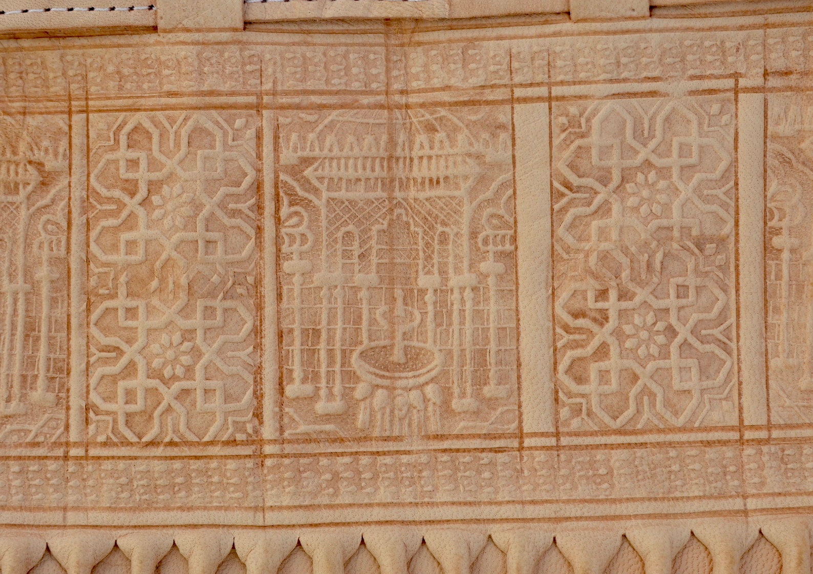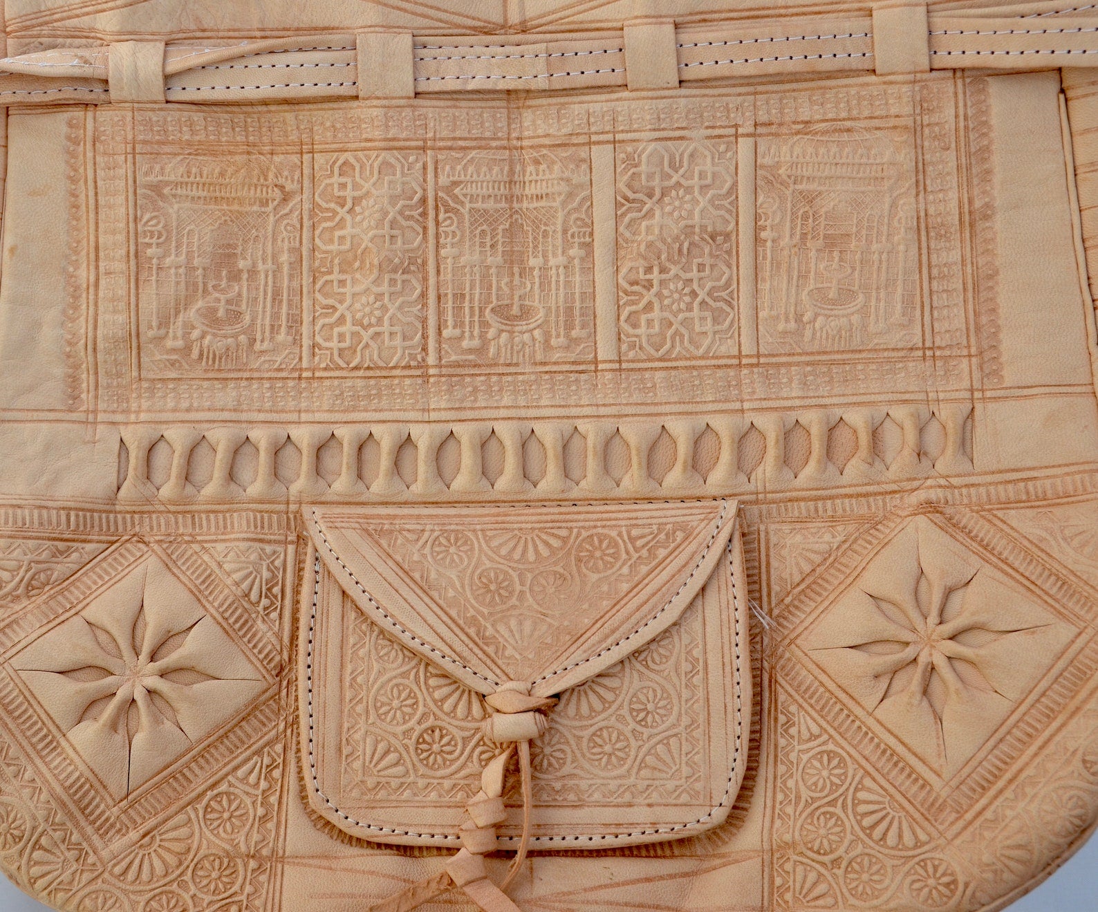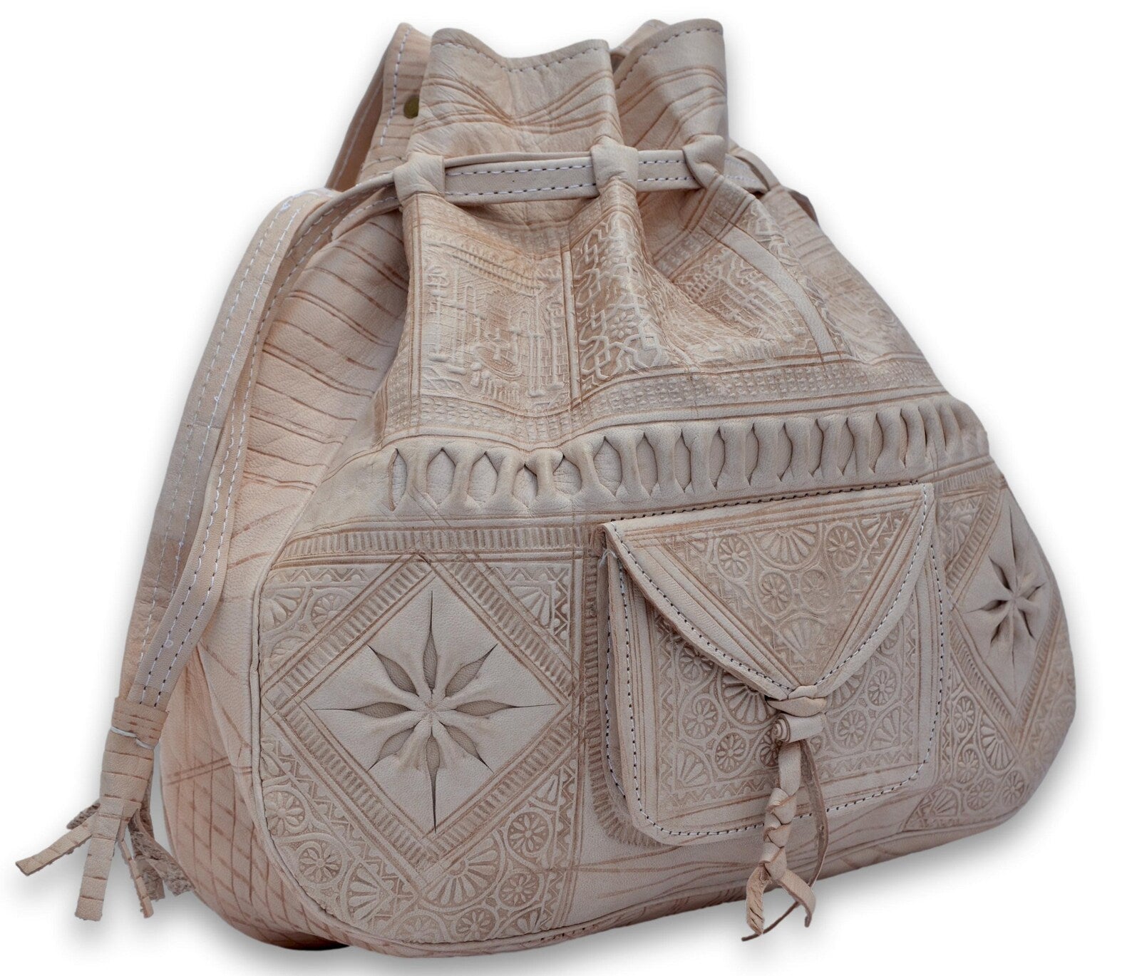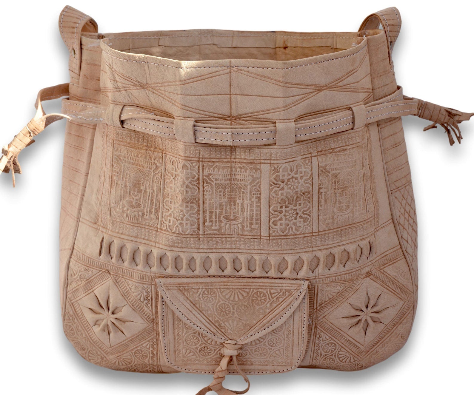 Make a statement with this bohemian twist on the classic 1970s Moroccan bucket bag, handcrafted from natural, undyed leather and detailed with intricate hand-embossed arabesque patterns.