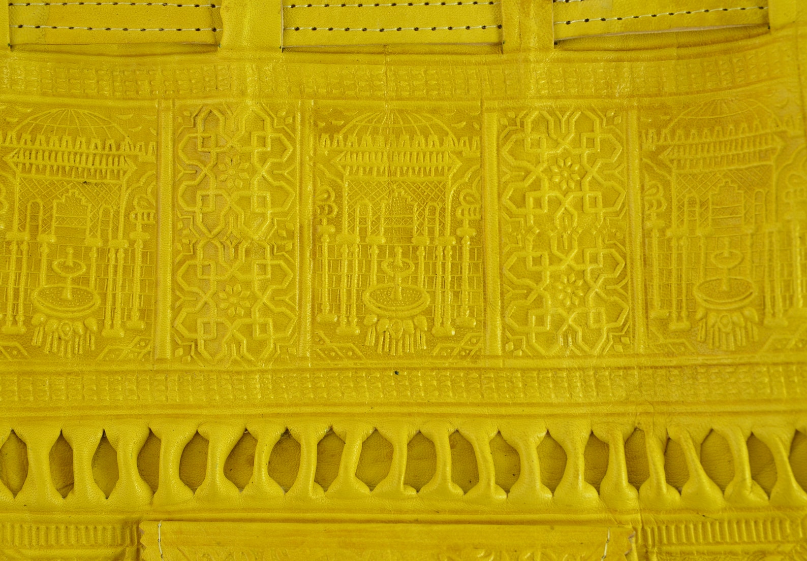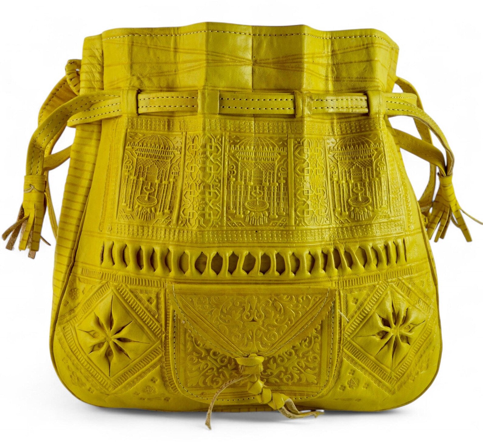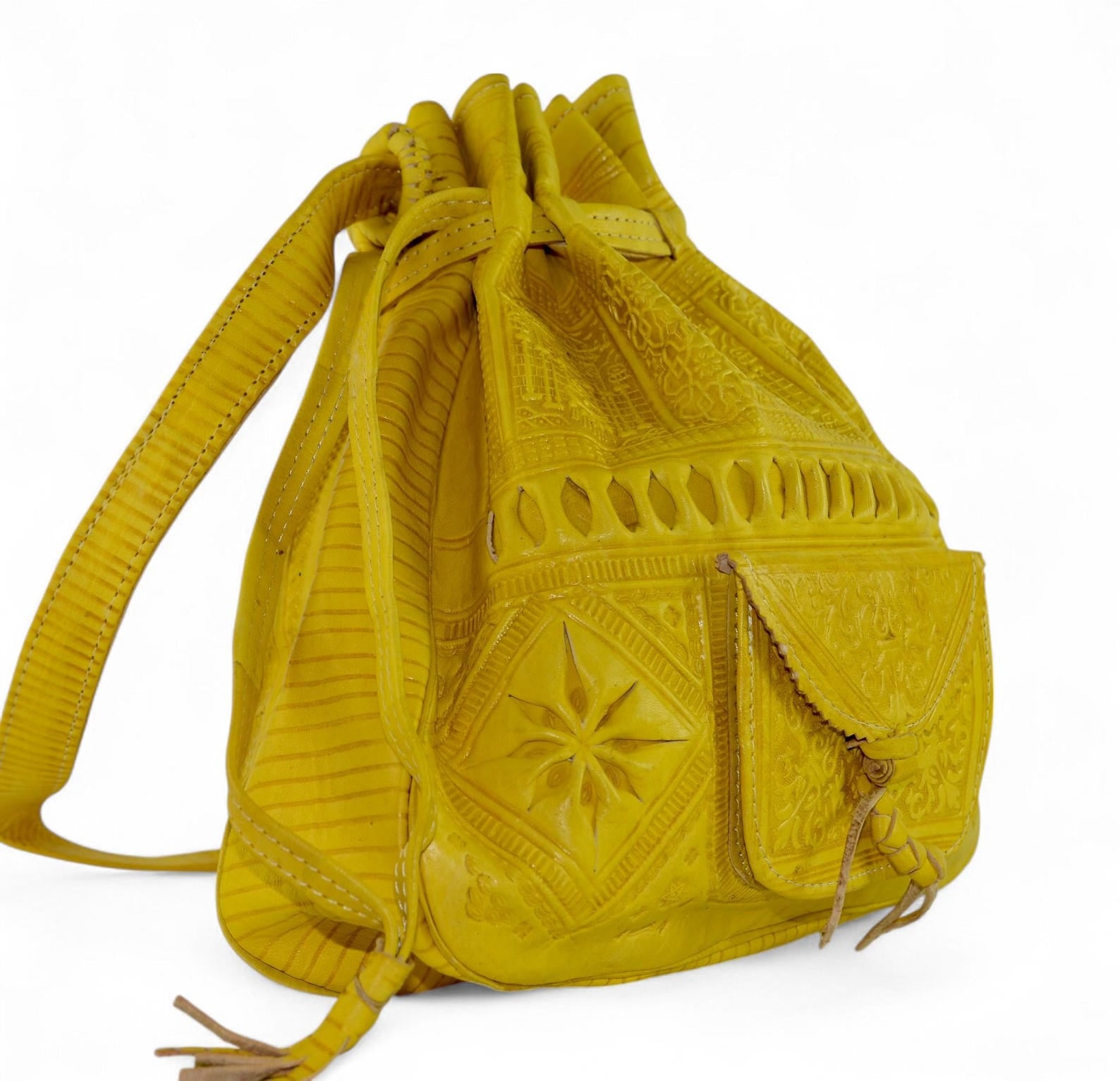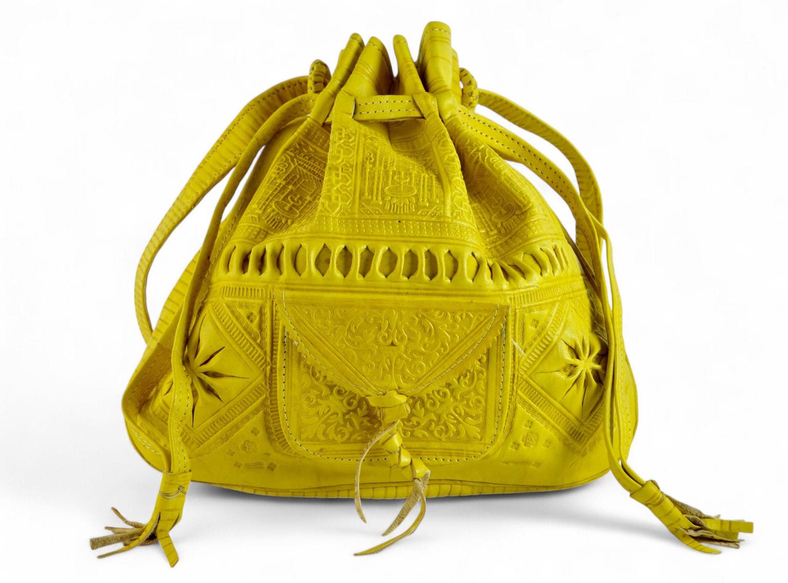 Brighten up your look with this bold and boho twist on the classic 1970s Moroccan bucket bag. Crafted in vibrant yellow leather, this standout piece is hand-embossed with detailed arabesque patterns, giving it a unique vintage flair.