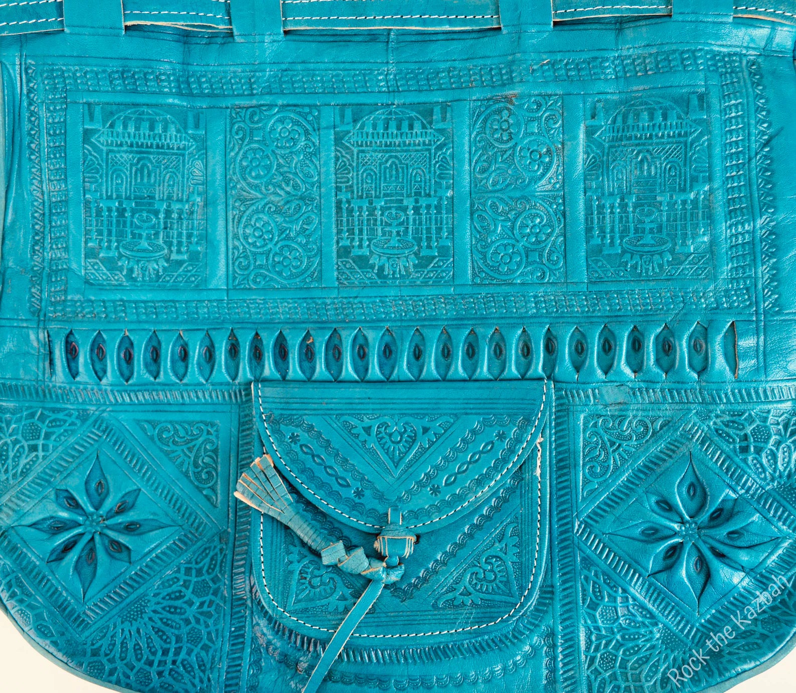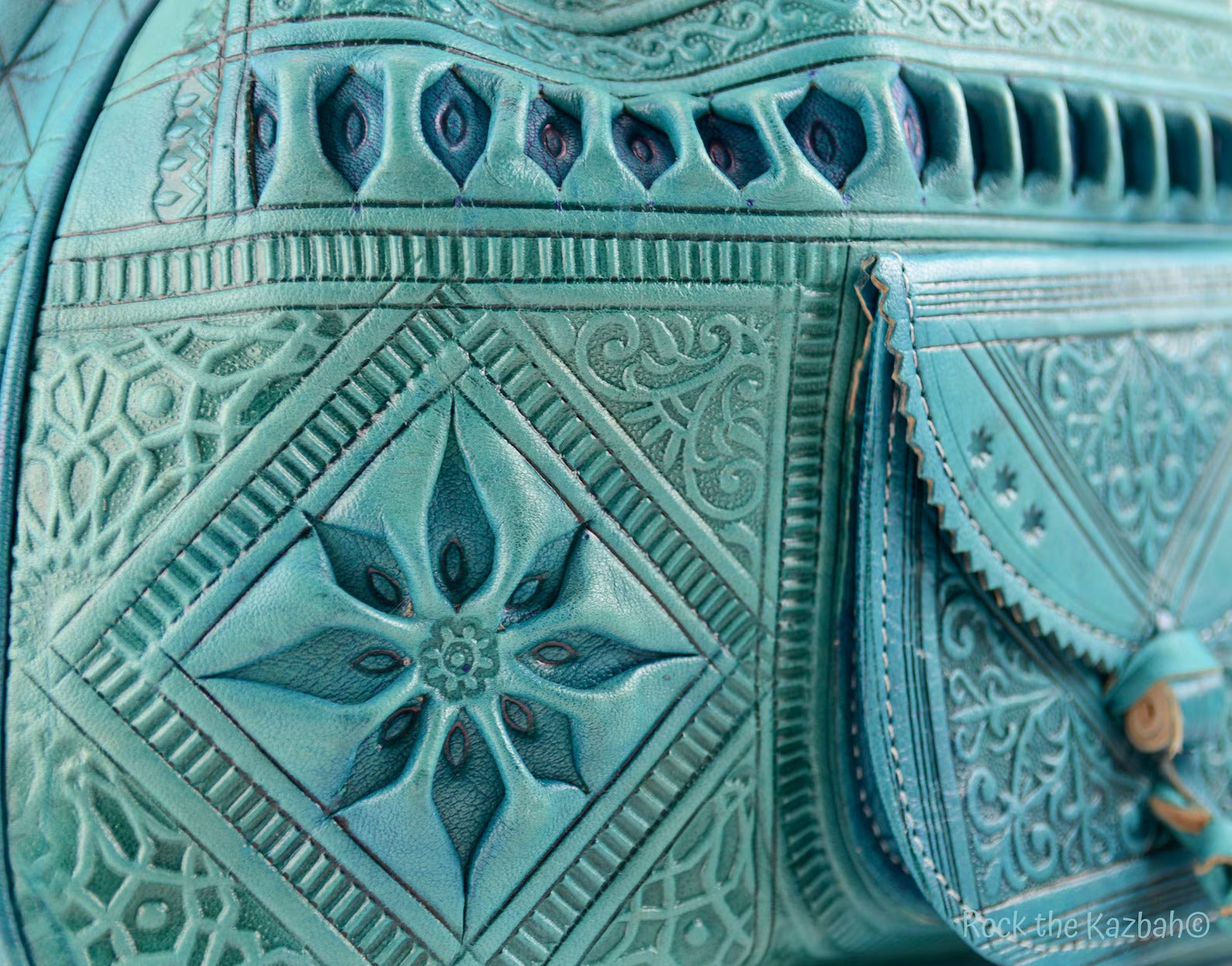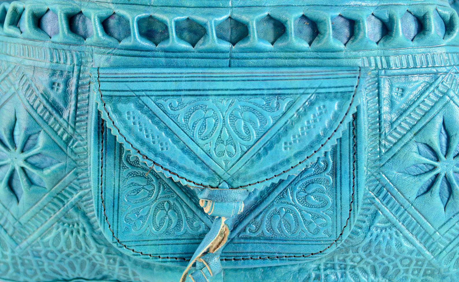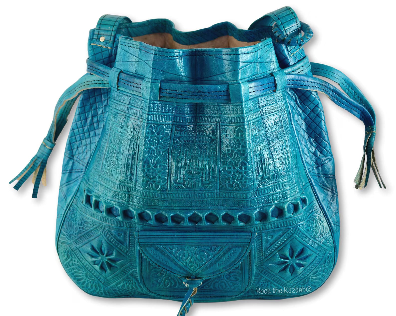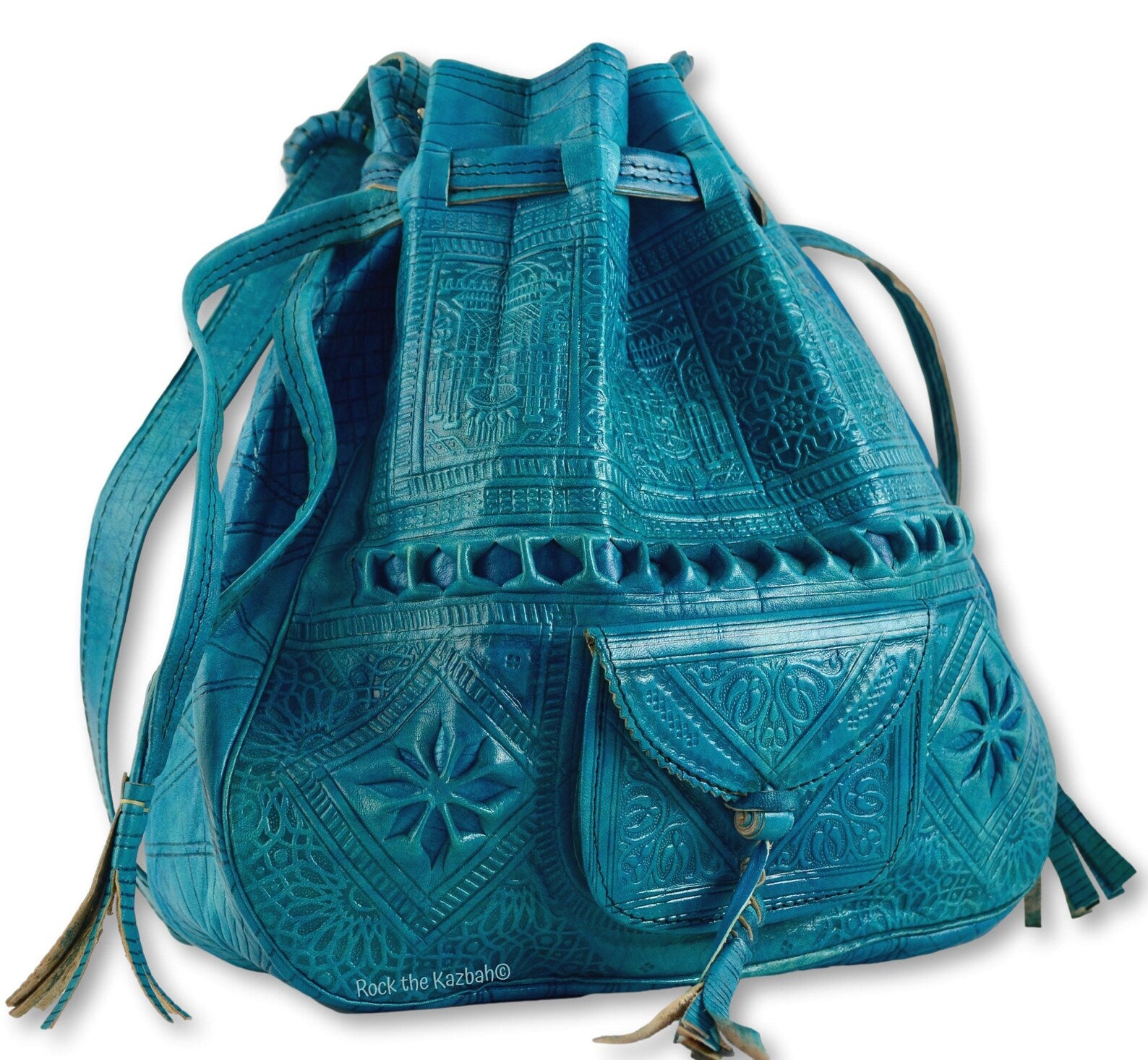 Turn heads with this vibrant, bohemian take on the classic 1970s Moroccan bucket bag. Crafted in a striking turquoise blue, this bag features hand-embossed arabesque detailing and a soft, natural finish — a bold yet timeless statement piece.