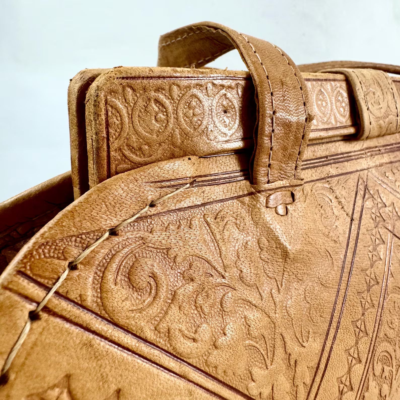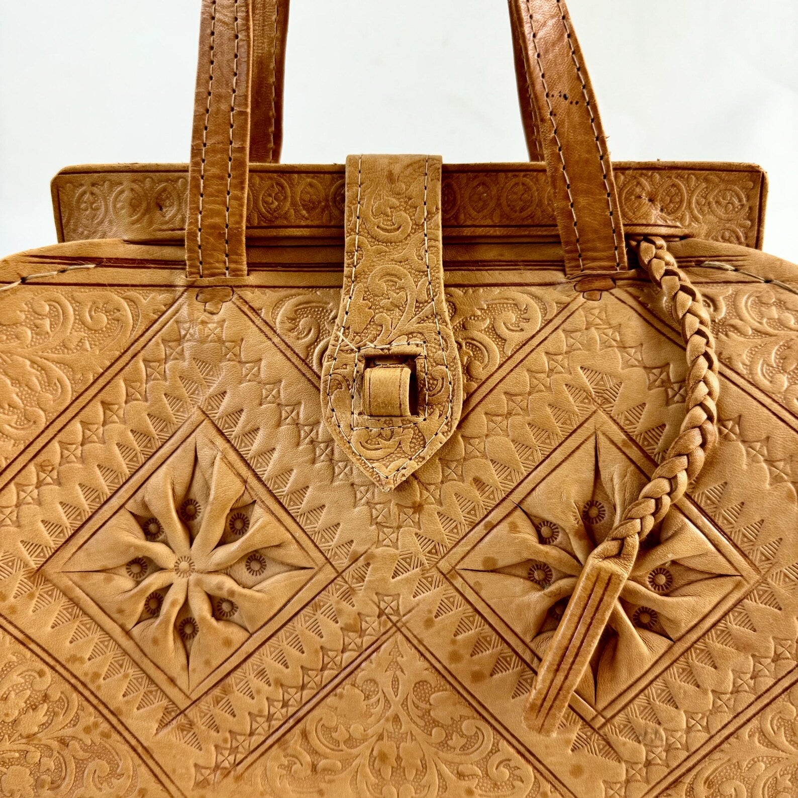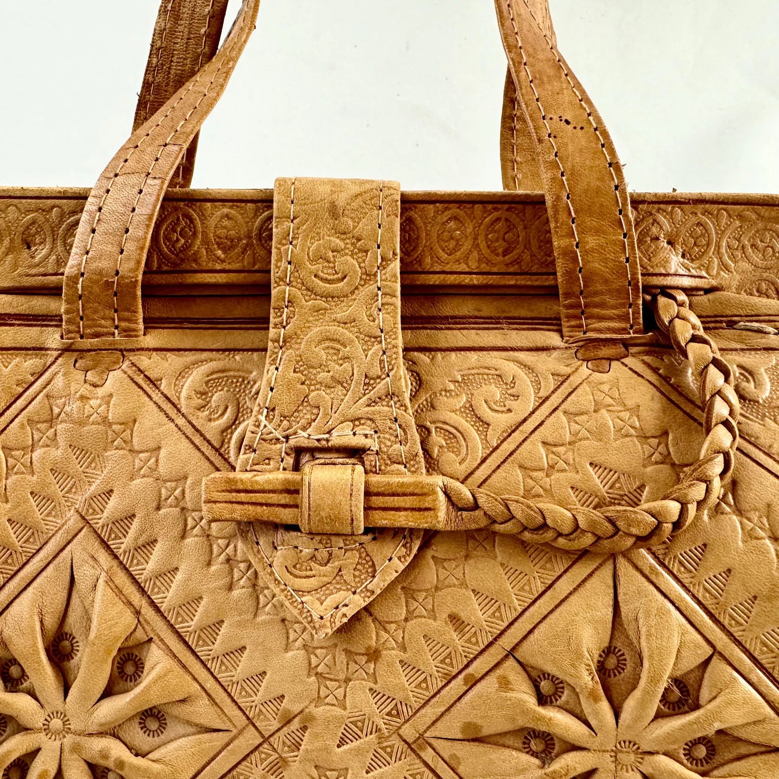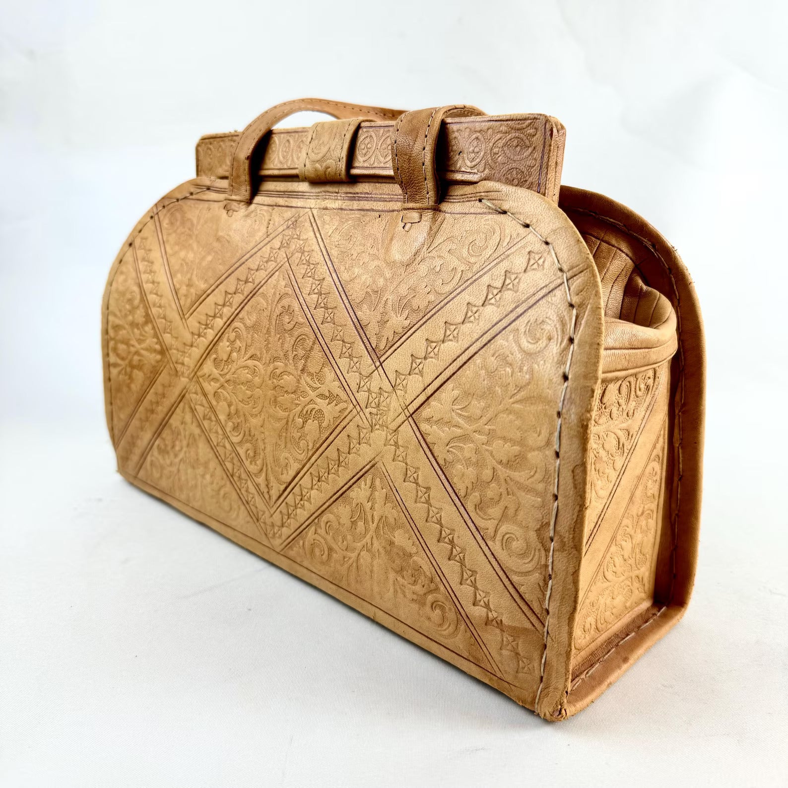 Step into vintage elegance with this handcrafted Moroccan tooled leather handbag, inspired by the rich design culture of the 1970s. Featuring intricate floral and geometric embossing, this one-of-a-kind piece blends timeless bohemian style with artisan craftsmanship.