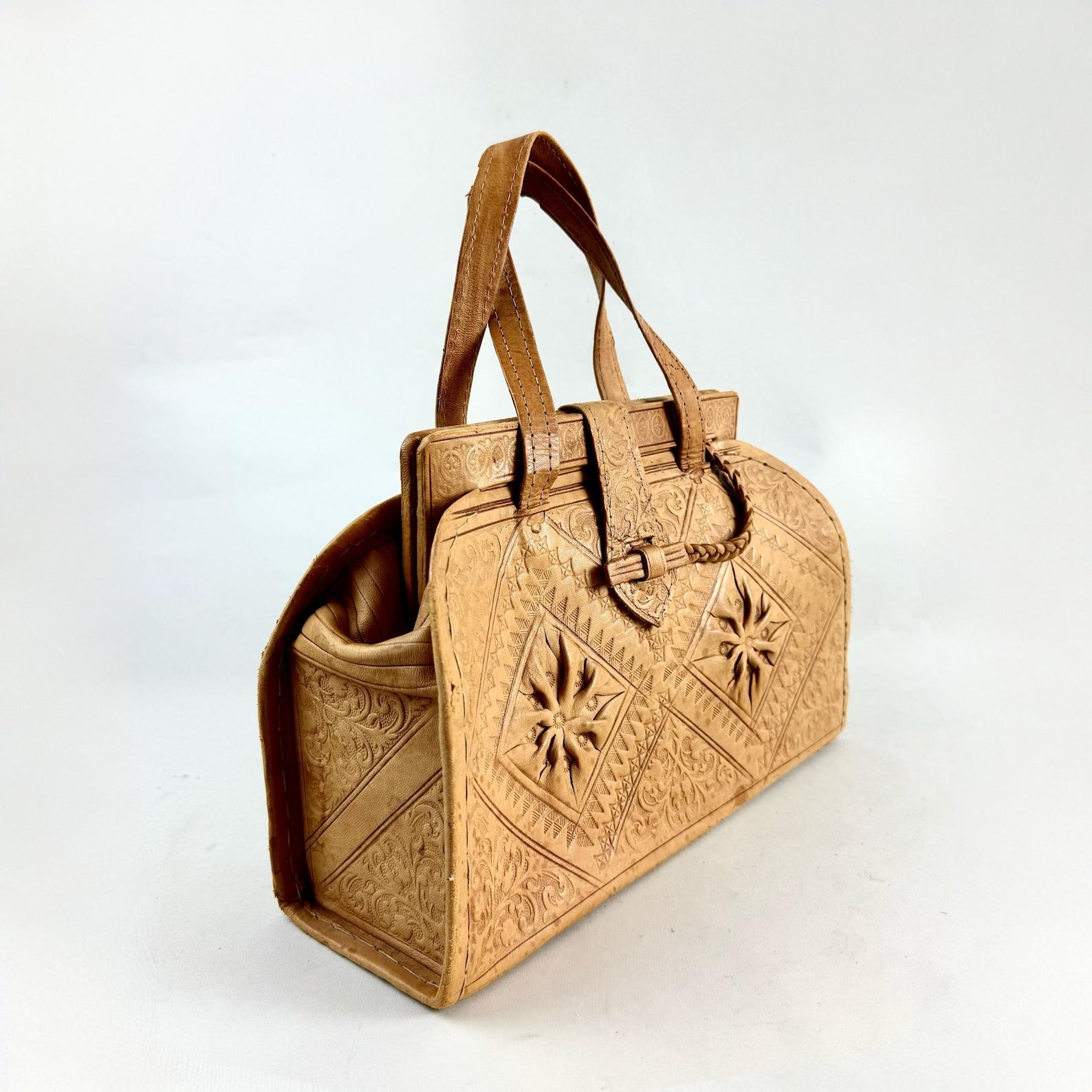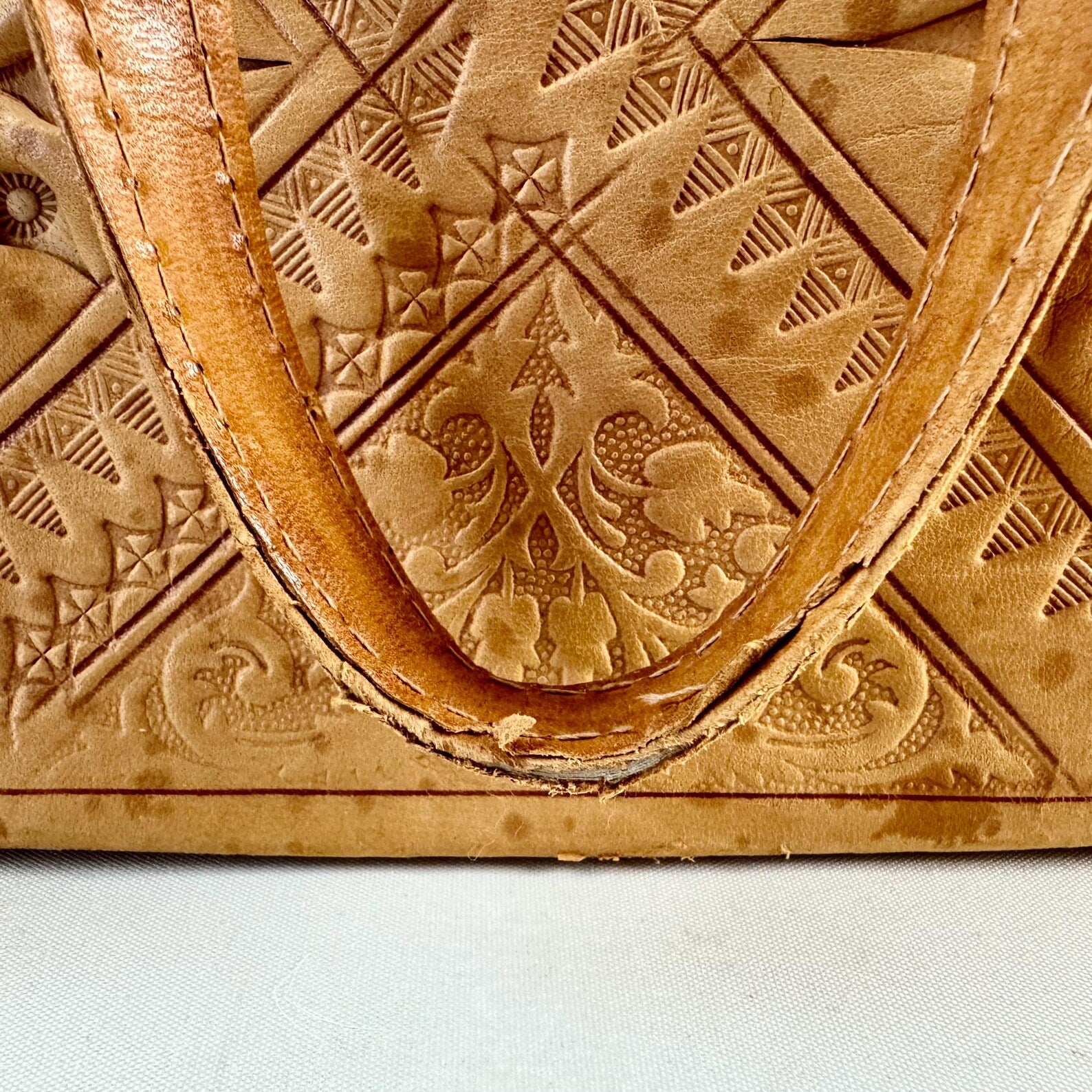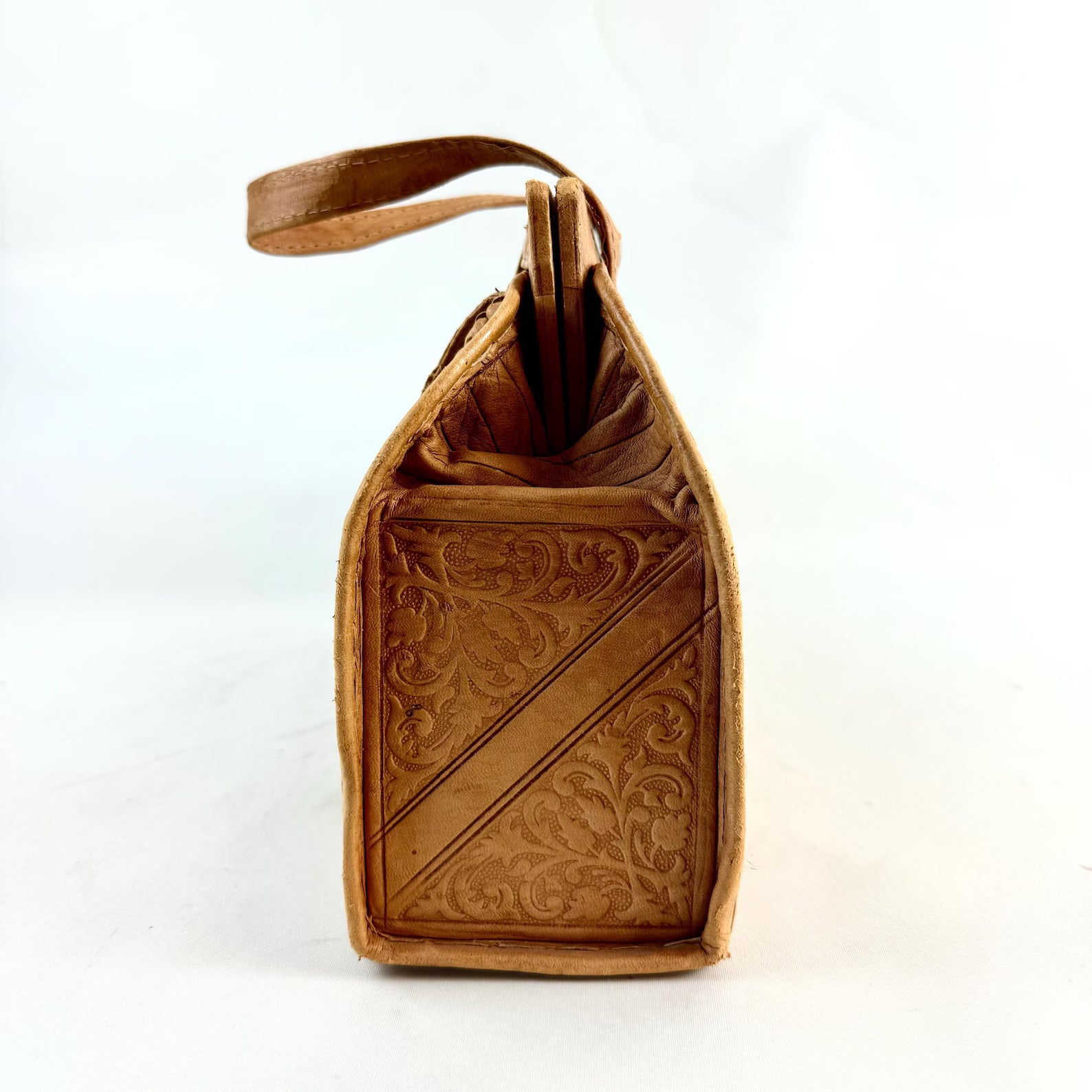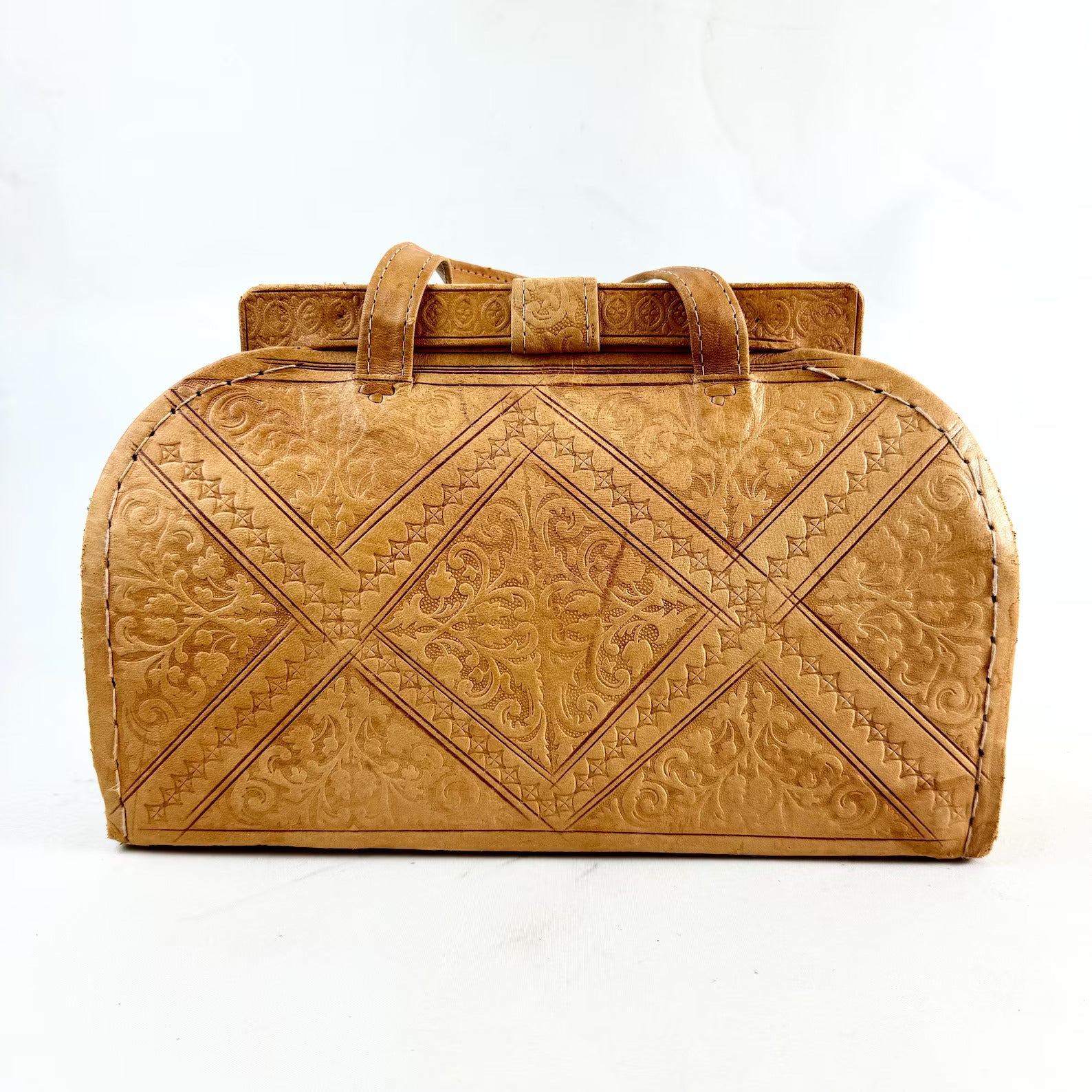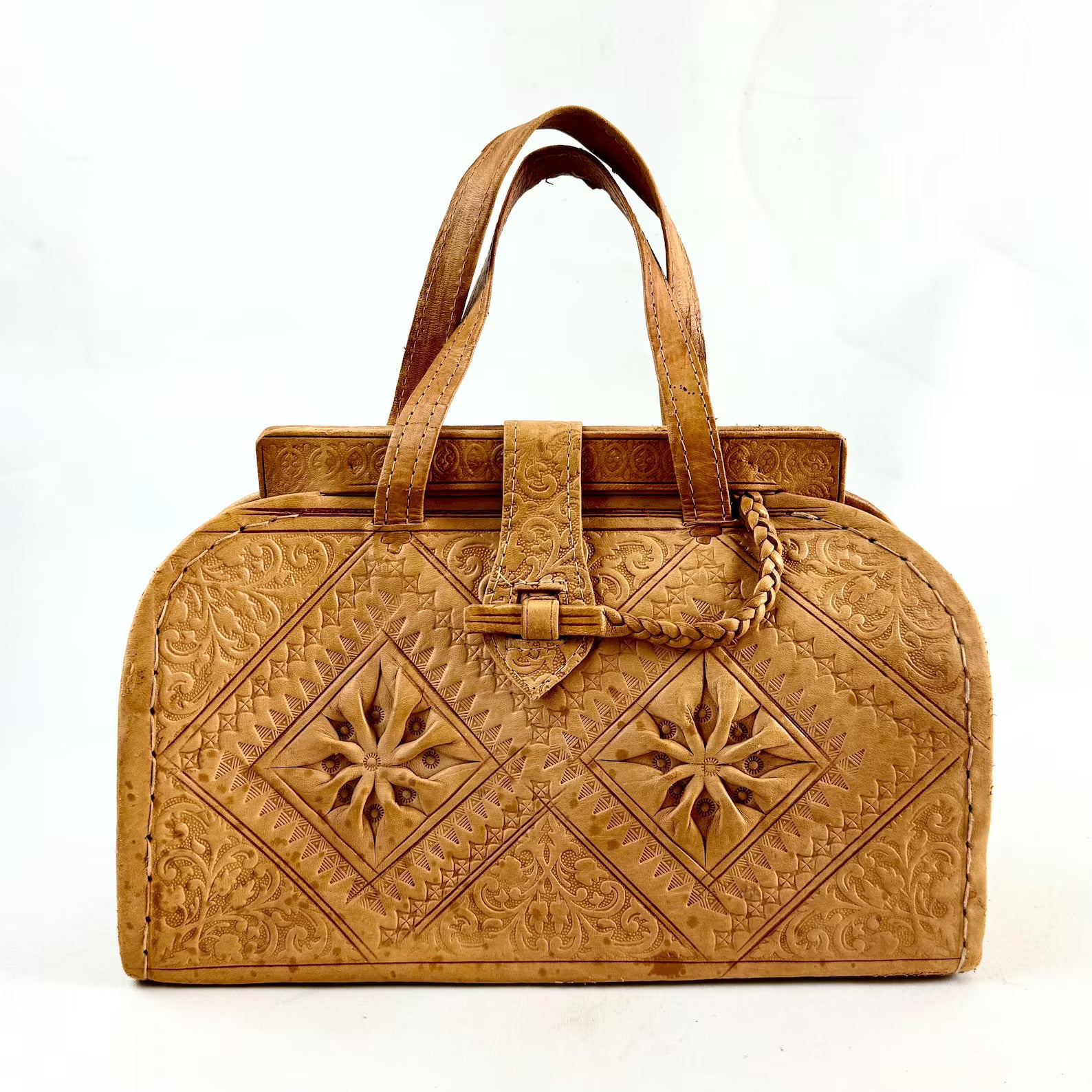 Step into vintage elegance with this handcrafted Moroccan tooled leather handbag, inspired by the rich design culture of the 1970s. Featuring intricate floral and geometric embossing, this one-of-a-kind piece blends timeless bohemian style with artisan craftsmanship.