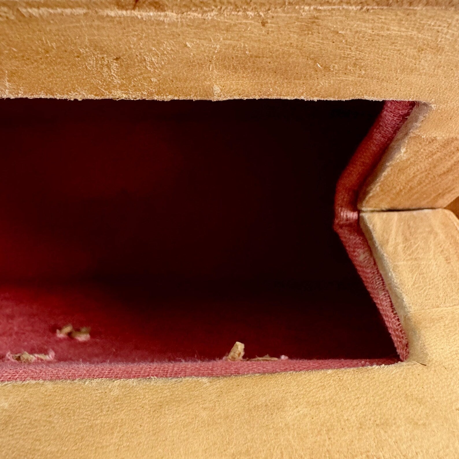 Made from natural tan leather and hand-tooled by Moroccan artisans, this structured bag features a braided leather clasp, sturdy handles, and a spacious interior lined in red cotton. Subtle signs of age enhance its authentic vintage charm.